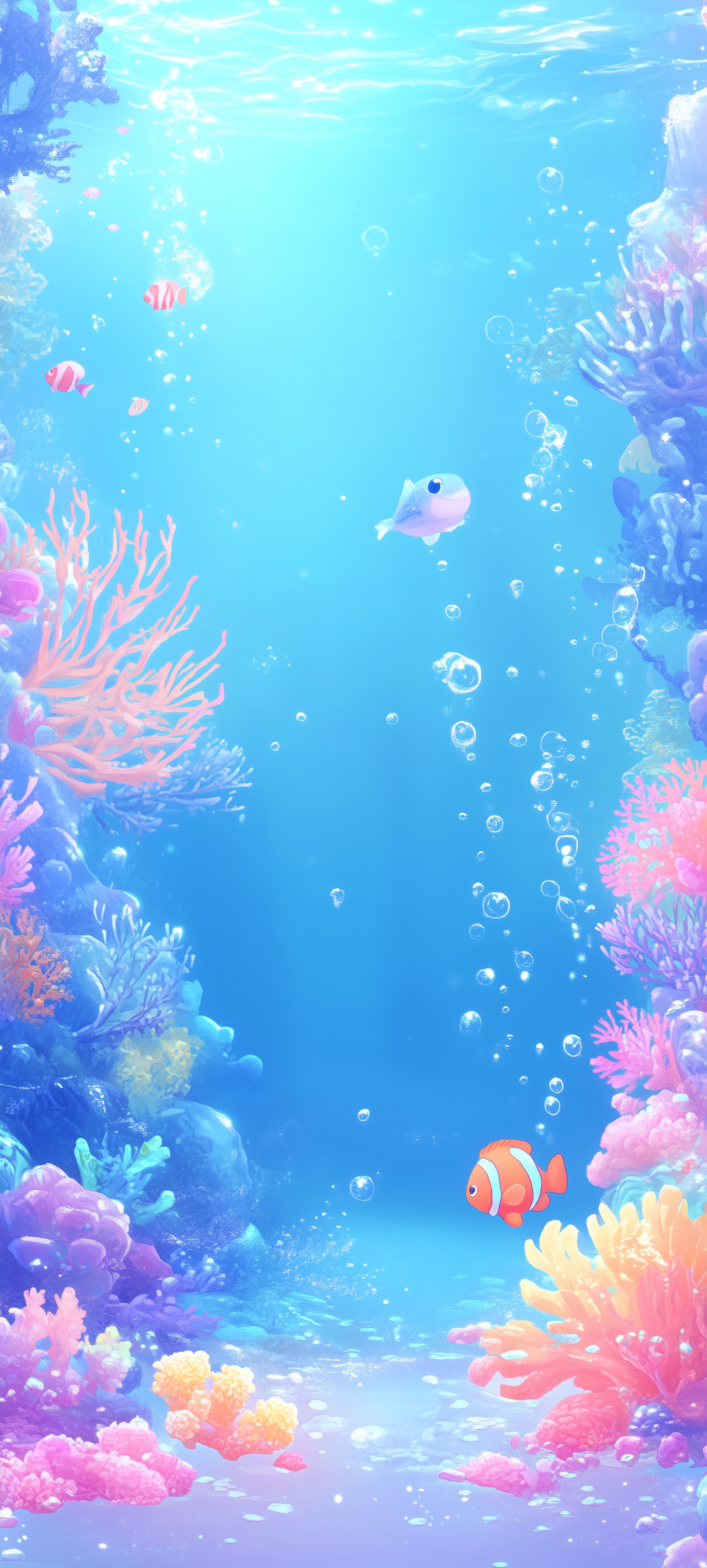 Dive into a whimsical underwater world with this wallpaper, showcasing colorful fish and lively coral. The bright, pastel tones create a cheerful and enchanting aquatic scene.