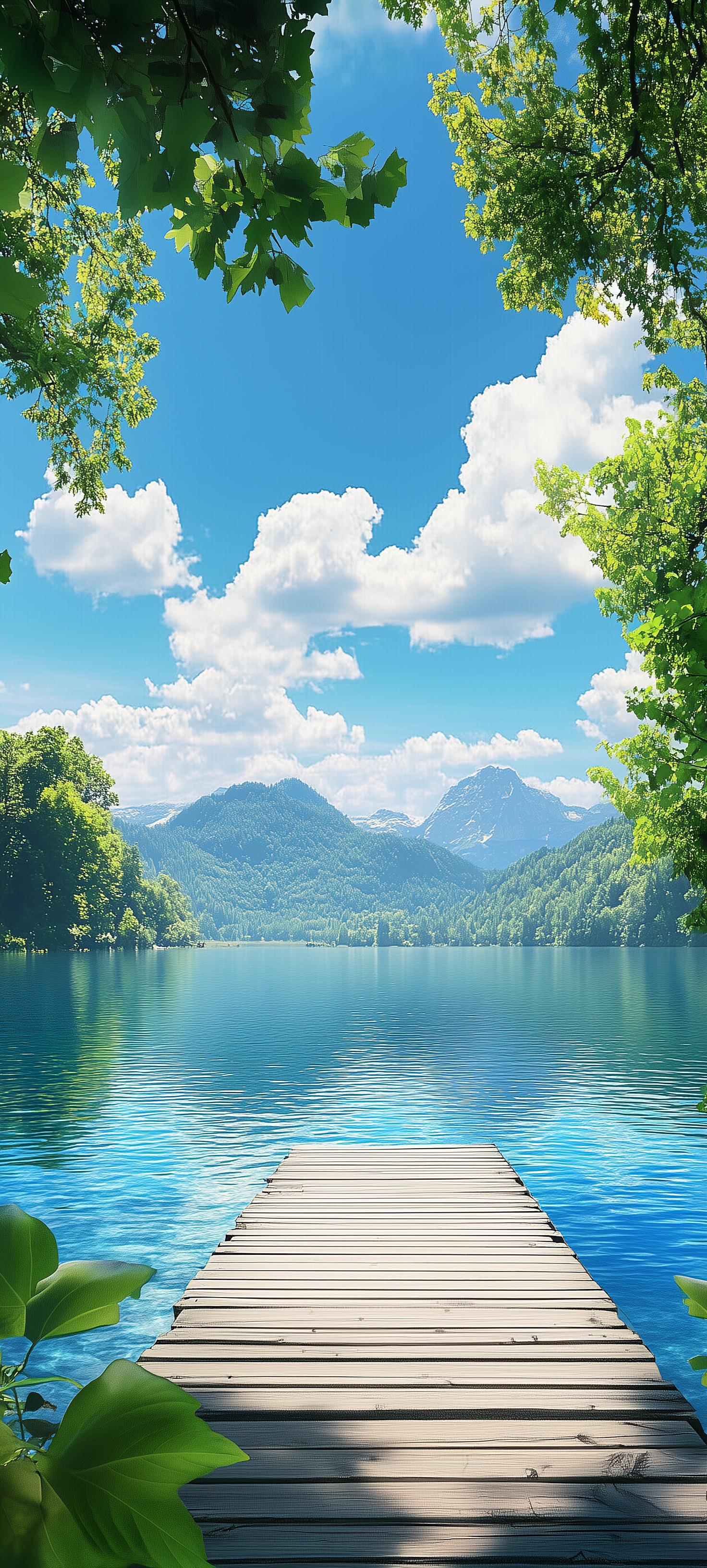 A picturesque lakeside view featuring a wooden pier extending into calm, crystal-clear waters. The serene backdrop of lush greenery and distant mountains adds to the tranquil atmosphere.